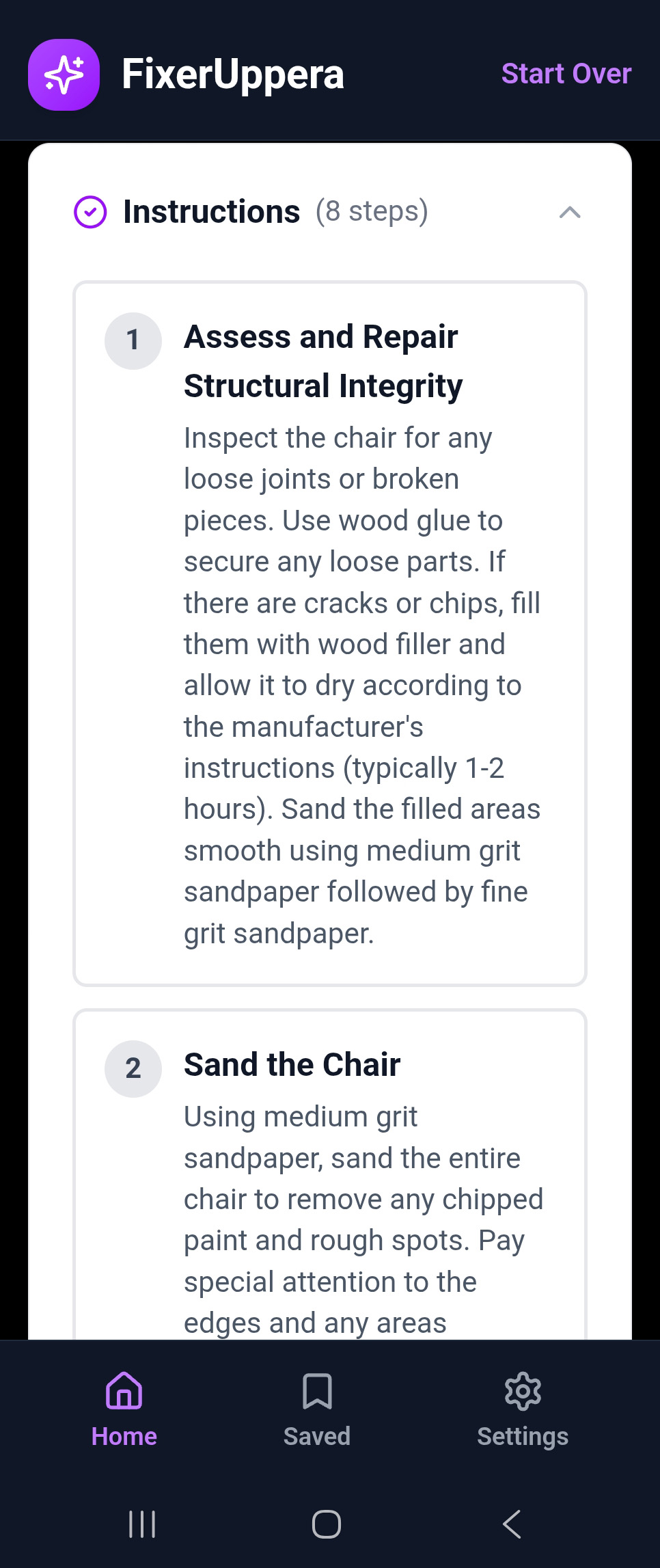 Access all your saved projects from the Saved tab on the home screen. Each saved project shows: