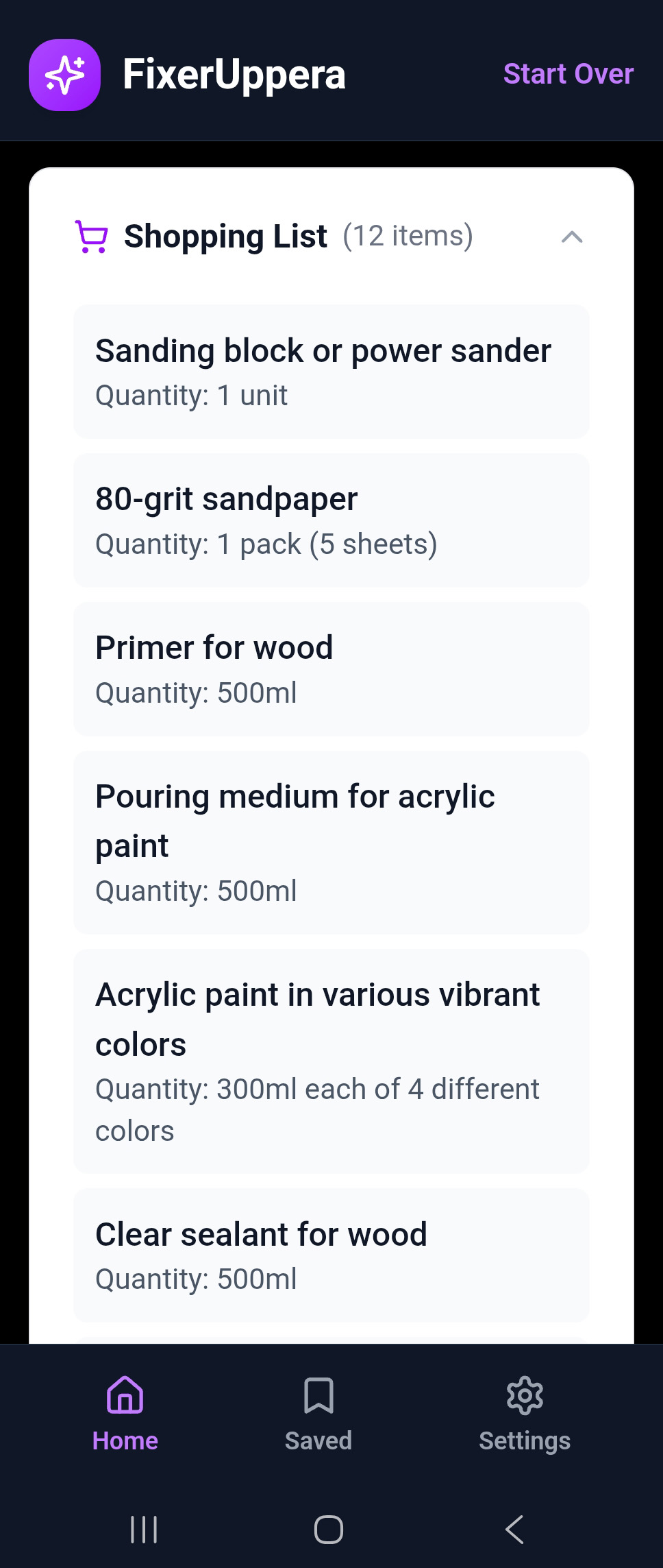 Access all your saved projects from the Saved tab on the home screen. Each saved project shows: